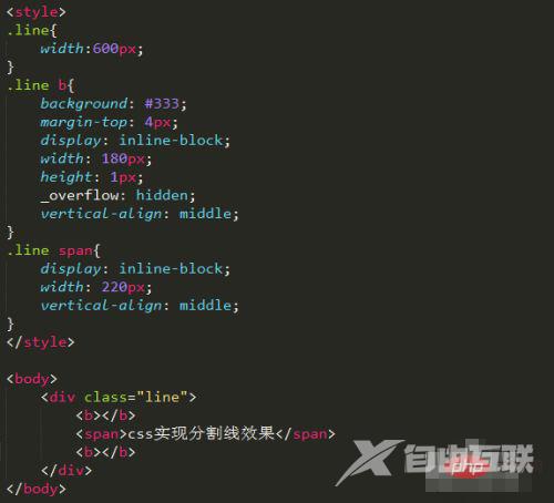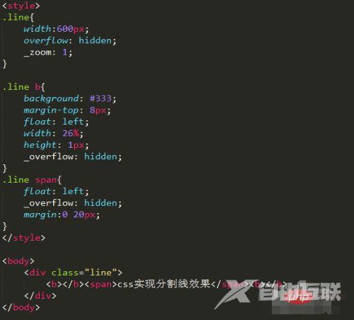 如果要做的网页背景色是纯色的话可以用这个方法来实现,代码很简洁,并且宽度可以自适应显示。这个方法主要就是设置文字的背景来盖住文字所在部分的线。