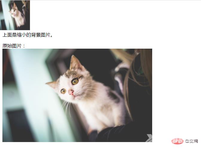 <!DOCTYPE html><html> <head> <meta charset="utf-8"> <style> body { background: url(img/5.jpg); background-size: 100px 100px; -moz-background-size: 100px 100px; /* 老版本的 Firefox */ background-repeat: no-repeat; padding-top: 80px; } </style> </head> <body> <p>上面是缩小的背景图片。</p> <p>原始图片:<br /> <img src="img/5.jpg" alt="Flowers"></p> </body></html>效果图: