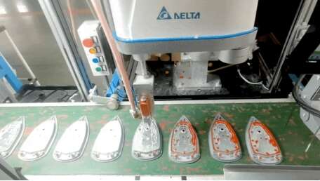 在华东地区电熨斗生产线上,为保证底板涂胶的准确性,机器人示教往往要调试4个小时以上,十分影响整体生产效率。