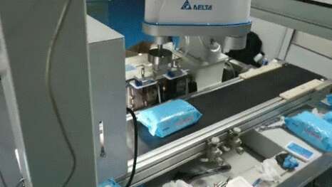台达充分利用SCARA工业机器的同步追踪、自动规划运动轨迹功能,搭配机器视觉系统强大的视觉监测算法,在传送带运行过程中实时捕捉湿巾盖位置,依次完成定位、抓取、涂胶与贴合作业,实现真正的在线追随作业,大幅缩短生产时间。
