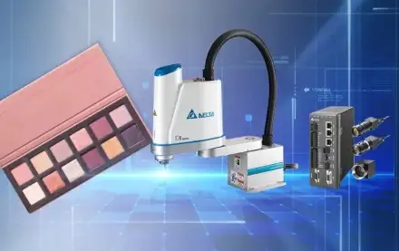 台达采用SCARA机器人与机器视觉系统相结合的方案,在高速运行的输送线上,以±0.1mm的抓取精度,将不同颜色的粉饼快速放入对应的粉饼盒中,实现生产质量与运行效率双提升。
