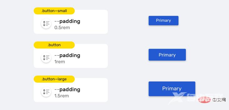 在设计系统中,按钮通常有多种尺寸。 通常,按钮可以具有三种尺寸(Small, normal, large)。 使用 CSS 变量来实现它并不容易: