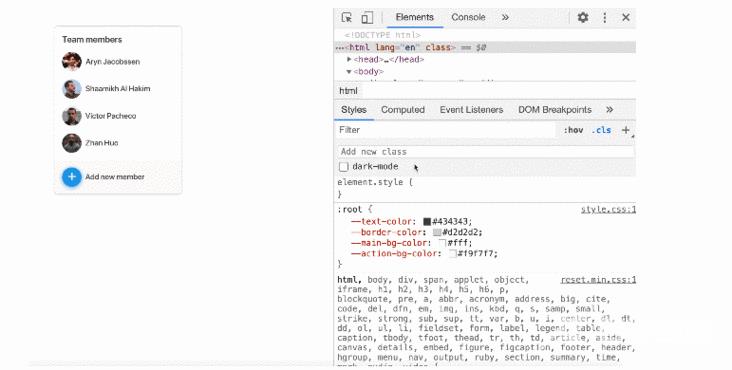 :root { --text-color: #434343; --border-color: #d2d2d2; --main-bg-color: #fff; --action-bg-color: #f9f7f7;}/* 添加到`<html>`元素的类*/.dark-mode { --text-color: #e9e9e9; --border-color: #434343; --main-bg-color: #434343; --action-bg-color: #363636;}