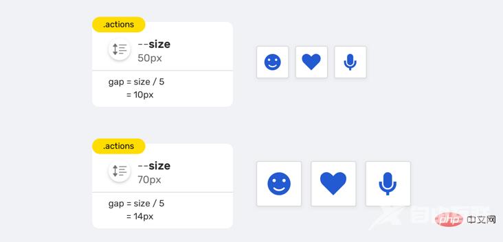 .actions { --size: 50px; display: flex; gap: calc(var(--size) / 5);}.actions--m { --size: 70px;}.actions__item { width: var(--size); height: var(--size);}请注意,这里是如何将变量--size用于flexbox gap属性的。 这意味着间距可以是动态的,并且取决于--size变量。