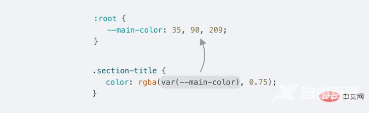 :root { --main-color: 35, 90, 209;}.section-title { color: rgba(var(--main-color), 0.75);}在示例中,我们有一个rgba()函数,并且RGB值存储在CSS变量中,以逗号分隔。 如果我们想根据元素调整alpha值,这样做可以提供灵活性。唯一的缺点是无法使用DevTools颜色选择器来调整rgba值。