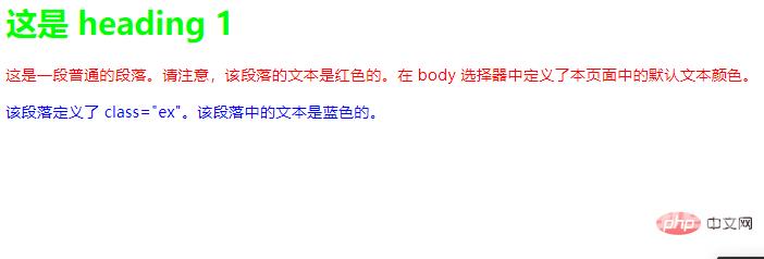 <html><head><style type="text/css">body {color:red}h1 {color:#00ff00}p.ex {color:rgb(0,0,255)}</style></head><body><h1>这是 heading 1</h1><p>这是一段普通的段落。请注意,该段落的文本是红色的。在 body 选择器中定义了本页面中的默认文本颜色。</p><p class="ex">该段落定义了 class="ex"。该段落中的文本是蓝色的。</p></body></html>运行结果: