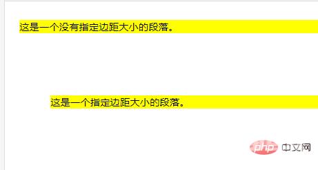 <!DOCTYPE html><html><head><meta charset="utf-8"> <title>php.cn</title> <style>p{ background-color:yellow;}p.margin{ margin-top:100px; margin-bottom:100px; margin-right:50px; margin-left:50px;}</style></head><body><p>这是一个没有指定边距大小的段落。</p><p class="margin">这是一个指定边距大小的段落。</p></body></html>运行结果: