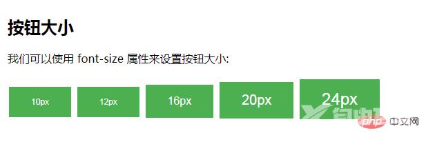 <!DOCTYPE html><html><head><meta charset="utf-8"> <title></title> <style>.button { background-color: #4CAF50; /* Green */ border: none; color: white; padding: 15px 32px; text-align: center; text-decoration: none; display: inline-block; font-size: 16px; margin: 4px 2px; cursor: pointer;}.button1 {font-size: 10px;}.button2 {font-size: 12px;}.button3 {font-size: 16px;}.button4 {font-size: 20px;}.button5 {font-size: 24px;}</style></head><body><h2>按钮大小</h2><p>我们可以使用 font-size 属性来设置按钮大小:</p><button class="button button1">10px</button><button class="button button2">12px</button><button class="button button3">16px</button><button class="button button4">20px</button><button class="button button5">24px</button></body></html>效果如下: