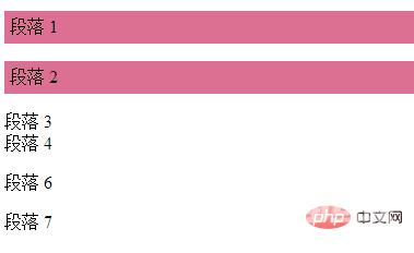 <!DOCTYPE html><html><head> <meta charset="utf-8"> <title>选择所有指定子元素</title> <style> .demo > p{ background-color: palevioletred; padding: 5px; } </style> </head> <body> <div class="demo"> <p>段落 1</p> <p>段落 2</p> <span>段落 3</span> <div>段落 4</div> </div> <p>段落 6</p> <p>段落 7</p></body> </html>效果图: