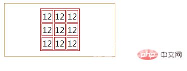 <!DOCTYPE html><html> <head> <meta charset="UTF-8"> <title>表格居中</title> <style> div{ width: 200px; padding: 10px; border: 1px solid peru; } table,td,tr { border: 1px solid red; margin: auto; } </style> </head> <body> <div> <table> <tr> <td>12</td> <td>12</td> <td>12</td> </tr> <tr> <td>12</td> <td>12</td> <td>12</td> </tr> <tr> <td>12</td> <td>12</td> <td>12</td> </tr> </table> </div> </body></html>效果图: