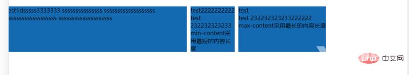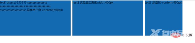 <div class="fit-content-wrapper"> <div class="fit-item item1">test1dsssss3333333 sssssssssssssss sssssssssssssssssss sssssssssssssssssss ssssssssssssssssssss 这是用了fit-content(400px)</div> <div class="fit-item item2">test2 这是固定宽度width:400px</div> <div class="fit-item item3">test3 这是fit-content(400px)</div></div> .fit-content-wrapper{ width: 100%; height: 200px; display: grid; grid-template-columns: fit-content(400px) 400px fit-content(400px); grid-gap: 10px; } .fit-item{ background-color: rgb(20, 106, 177); }效果