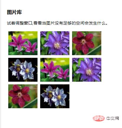 <style>.thumbnail { float:left; width:110px; height:90px; margin:5px;}</style></head><body><h3>图片库</h3><p>试着调整窗口,看看当图片没有足够的空间会发生什么。</p><img class="thumbnail" src="/images/klematis_small.jpg" width="107" height="90"><img class="thumbnail" src="/images/klematis2_small.jpg" width="107" height="80"><img class="thumbnail" src="/images/klematis3_small.jpg" width="116" height="90"><img class="thumbnail" src="/images/klematis4_small.jpg" width="120" height="90"><img class="thumbnail" src="/images/klematis_small.jpg" width="107" height="90"><img class="thumbnail" src="/images/klematis2_small.jpg" width="107" height="80"><img class="thumbnail" src="/images/klematis3_small.jpg" width="116" height="90"><img class="thumbnail" src="/images/klematis4_small.jpg" width="120" height="90"></body></html>运行结果: