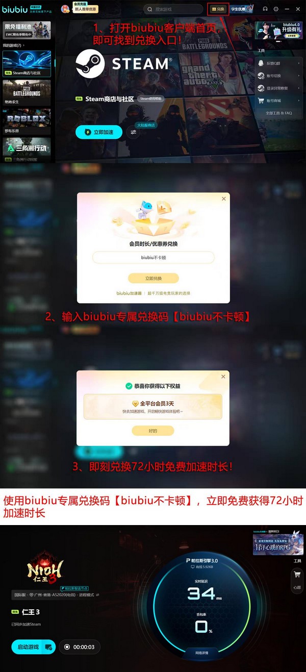 新用户可通过输入口令“biubiu不卡顿”免费领取3天高级会员权益,叠加首日24小时试用期,总计可享4天完整加速服务。该权益覆盖Steam与PS5平台的全链路加速需求,包括游戏下载、更新同步及在线对战环节。