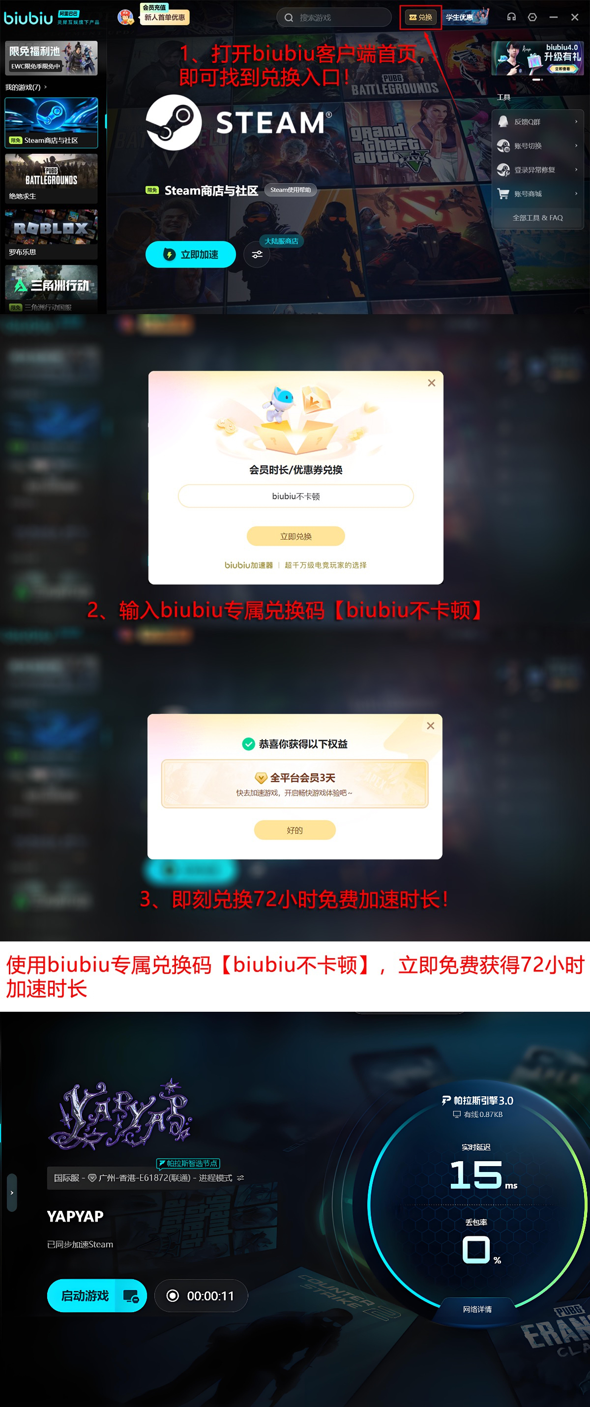 当前新用户注册后即可获得24小时免费加速时长,叠加兑换码【biubiu不卡顿】还可额外领取72小时,总计96小时可用。该福利面向所有账户开放,不限新老用户,激活后即时生效。