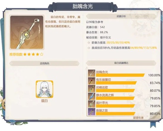 常驻武器,不推荐特意去抽,能用的基本都有更好的武器选择,叶洛亚倒是可以带,所以如果正好抽了兹白,有叶洛亚但没武器,可以考虑去捞,即使出了五星也有可能是兹白的专武,也算不错。