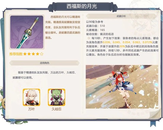 很不错的精通转充能武器,但现在能用的角色万叶和久岐忍上场的机会都越来越少,作为抽五星武器的副产物非常不错,但不建议专门抽