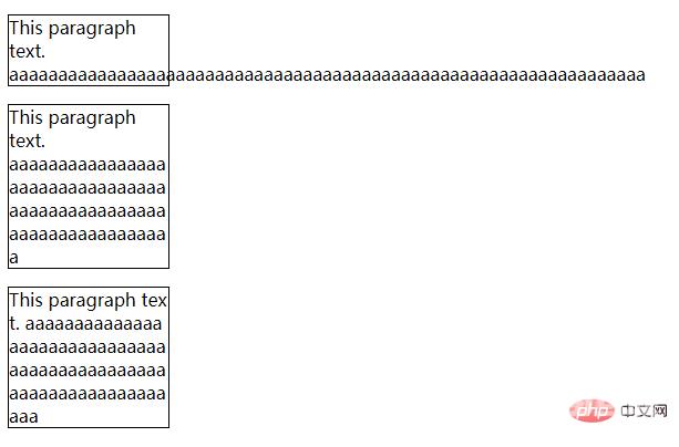 <!DOCTYPE html><html><head><meta charset="utf-8"> <style> p{ width:9em; border:1px solid #000000;}p.test1{ word-wrap:break-word;}p.test2{ word-break:break-all;}</style></head><body><p> This paragraph text. aaaaaaaaaaaaaaaaaaaaaaaaaaaaaaaaaaaaaaaaaaaaaaaaaaaaaaaaaaaaaaaaa </p><p class="test1"> This paragraph text. aaaaaaaaaaaaaaaaaaaaaaaaaaaaaaaaaaaaaaaaaaaaaaaaaaaaaaaaaaaaaaaaa </p><p class="test2"> This paragraph text. aaaaaaaaaaaaaaaaaaaaaaaaaaaaaaaaaaaaaaaaaaaaaaaaaaaaaaaaaaaaaaaaa </p></body></html>效果图: