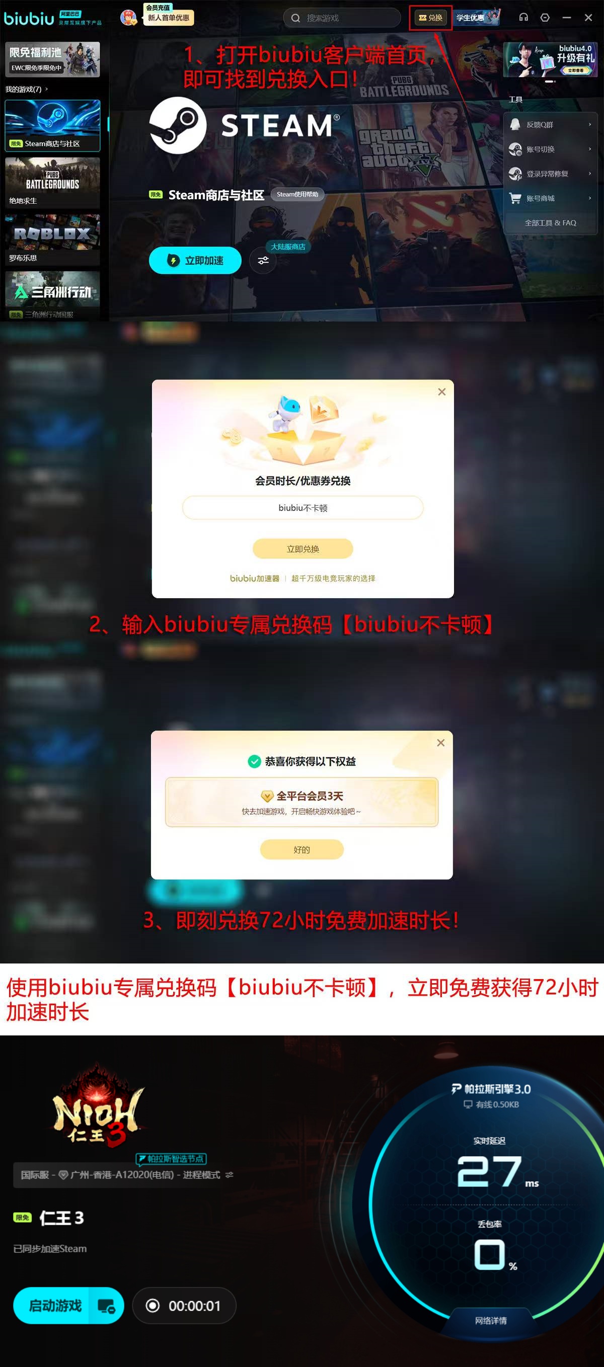 新注册用户首次启动服务即可获得24小时免费加速权益;如需延长试用周期,可在激活界面输入兑换码【biubiu不卡顿】,额外领取3天全功能加速权限。
