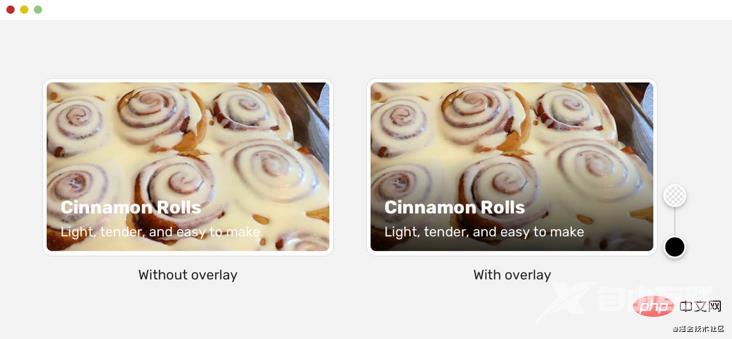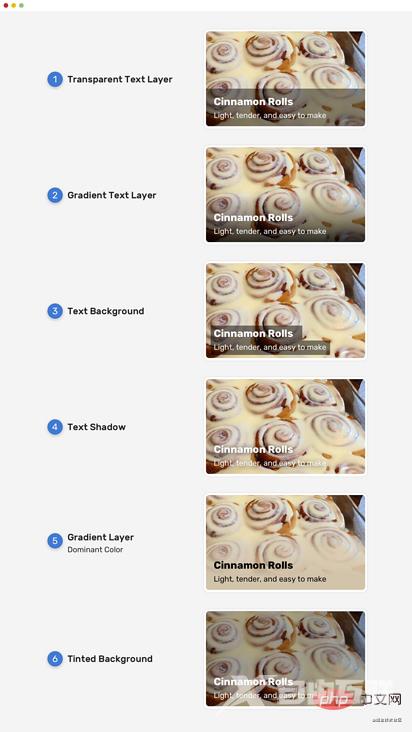 注意上图上,没有渐变覆盖的版本几乎不可读,这是对用户不利。 为了解决这个问题,我们需要在文本下方添加一个图层,便于阅读。 添加图层也有要注意的地方。因为,很多解决方案中没有考虑到可访问性。