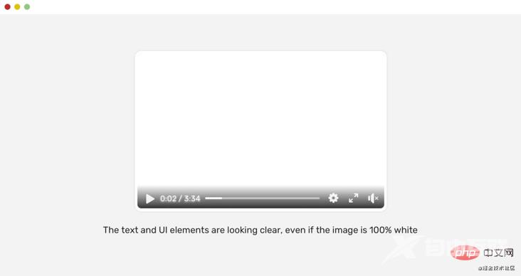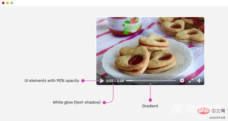 .player__icon { opacity: 0.9;}.player__time { color: #fff; text-shadow: 0 0 5px #fff;}播放图标为opacity: 0.9。 这有助于使它们与下面的背景融为一体。 给人一种感觉:控件是混合在一起的。