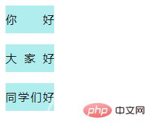 <!DOCTYPE html><html><head> <meta charset="UTF-8"> <style> p{ width: 70px; height: 40px; line-height: 40px; background: paleturquoise; text-align: justify; } p > span { display: inline-block /* Opera */; padding-left: 100%; } </style></head><body> <p>你好<span></span></p> <p>大家好<span></span></p> <p>同学们好<span></span></p></body></html>效果图: