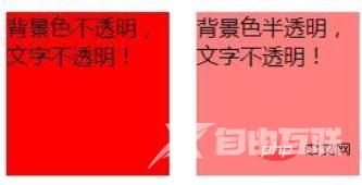 <!DOCTYPE html><html> <head> <meta charset="UTF-8"> <title>rgba()</title> <style> .demo{ width: 350px; height: 300px; margin: 50px auto; } .demo *{ width: 120px; height: 120px; margin: 10px; float: left; } .demo1{ background:rgba(255,0,0,1); } .demo2{ background:rgba(255,0,0,0.5); } </style> </head> <body> <p class="demo"> <p class="demo1">背景色不透明,文字不透明!</p> <p class="demo2">背景色半透明,文字不透明!</p> </p> </body> </html>效果图: