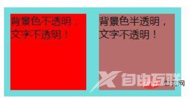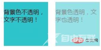 <!DOCTYPE html><html> <head> <meta charset="UTF-8"> <title>opacity属性</title> <style> .demo{ width: 280px; height: 140px; margin: 50px auto; } .demo1,.demo2{ width: 120px; height: 120px; margin: 10px; float: left; background:#2DC4CB; } .demo1{ opacity:1; } .demo2{ opacity:0.5; } </style> </head> <body> <p class="demo"> <p class="demo1"> <p>背景色不透明,文字不透明!</p> </p> <p class="demo2"> <p>背景色透明,文字也透明!</p> </p> </p> </body></html>效果图: