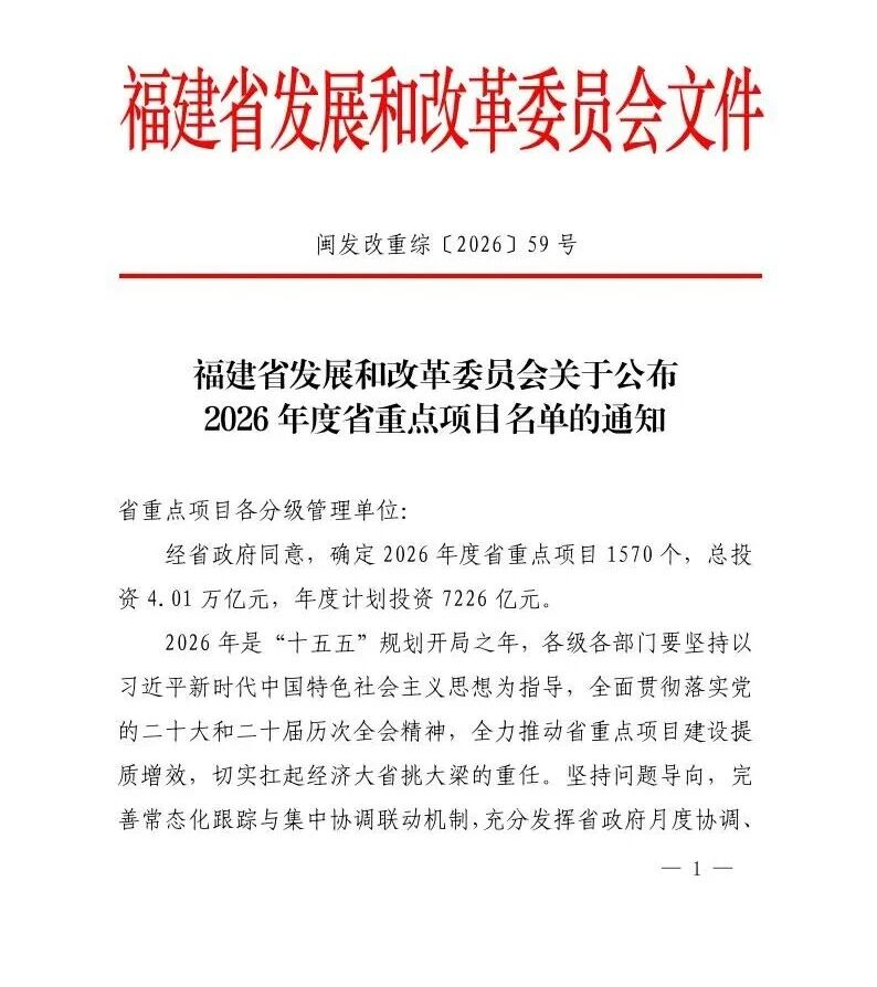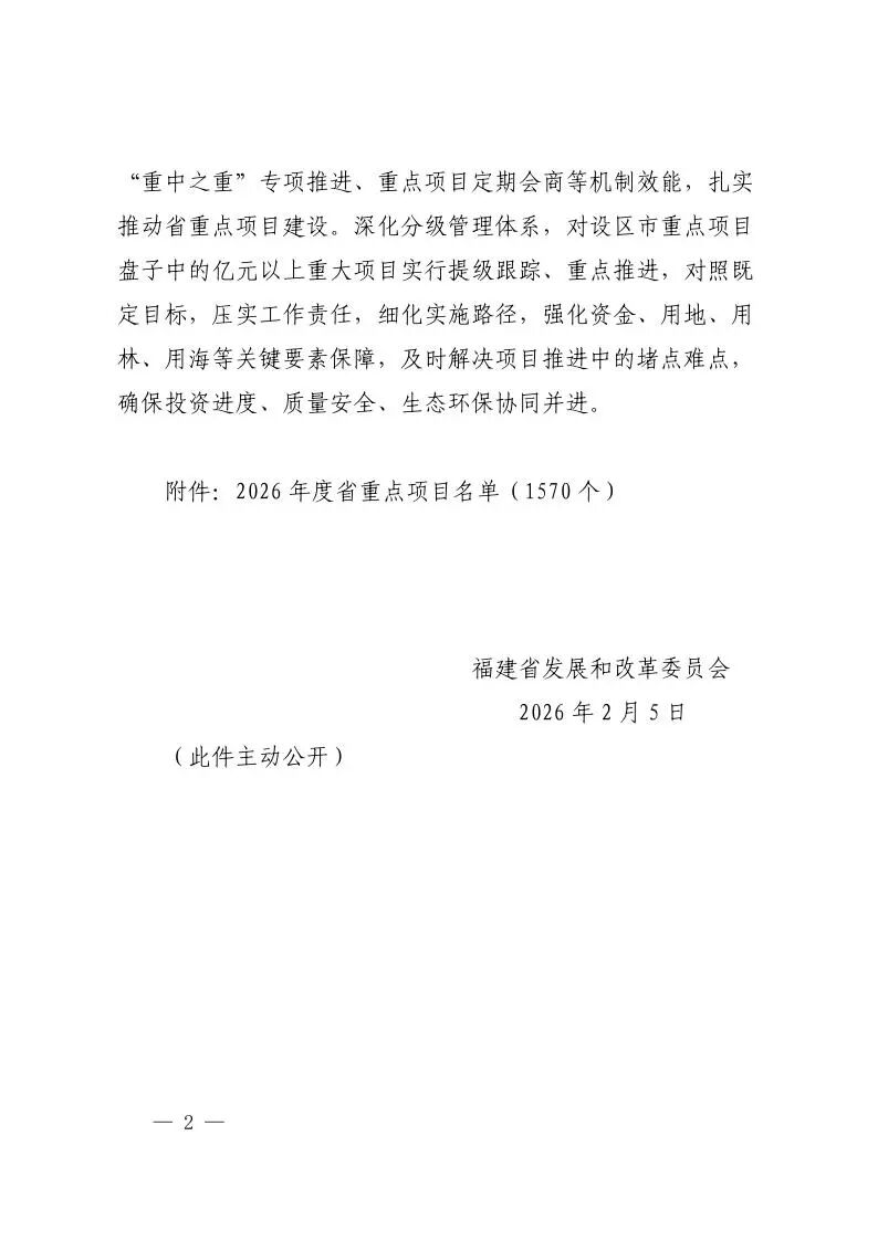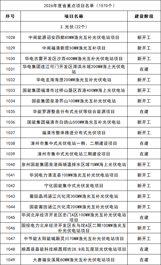 2026年2月5日,福建省发改委发布《关于公布2026年度省重点项目名单的通知》,其中光伏项目共计24个。