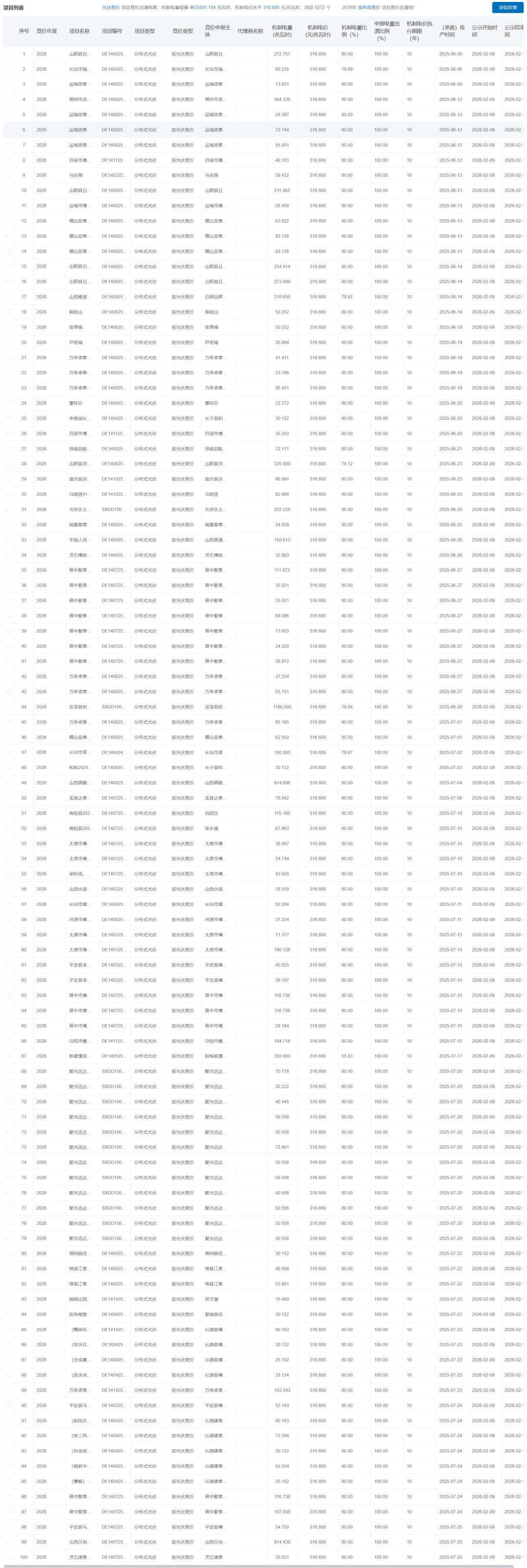 按光伏竞价项目竞价出清结果:机制电量规模4625501.154兆瓦时,机制电价水平316.800元/兆瓦时,项目5272个。