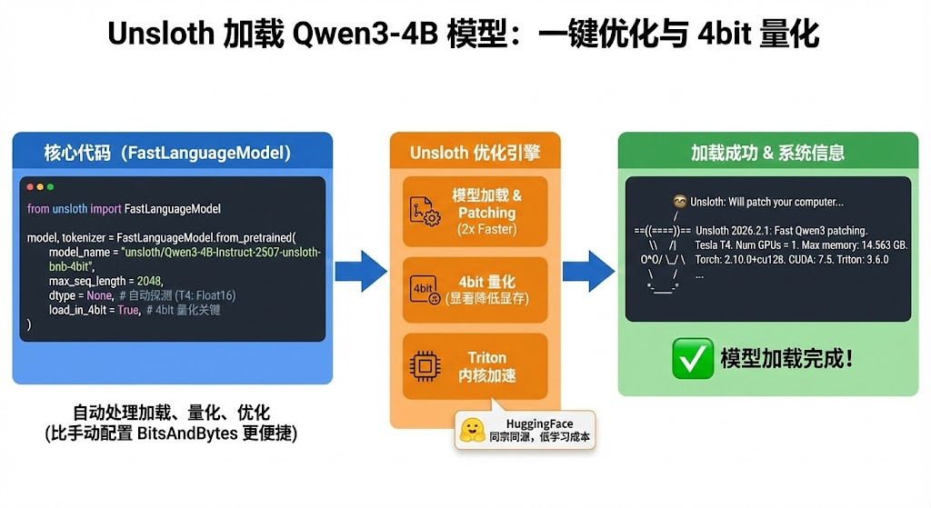 Unsloth 提供了一个 FastLanguageModel 类,它把模型加载、量化、优化全包圆了。我们不需要自己去写 BitsAndBytesConfig,这也是咱们选择unsloth的一个原因,轻便好用,哈哈哈。