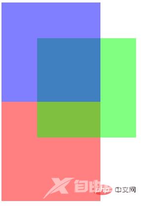 .box1{ position:relative; width:200px;height:200px; background-color: #00f; z-index:10; opacity:0.5; } .box2{ position:absolute; top:80px; left:80px; width:200px; height:200px; background-color:#0f0; z-index:5; opacity:0.5; } .box3{ position:relative; width:200px; height:200px; background-color:#f00; z-index:1; opacity:0.5;}表现效果: