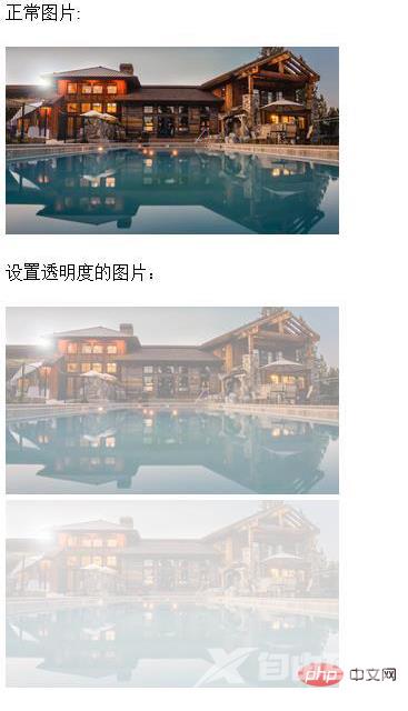<!DOCTYPE html><html> <head> <meta charset="UTF-8"> <style> .opacity1 { opacity: 0.5; filter: none; } .opacity2 { opacity: 0.2; filter: none; } </style> </head> <body> <div> 正常图片:<br /><br /> <img src="1.jpg" width="300px" /></div><br /> <div> 设置透明度的图片:<br /><br /> <img class="opacity1" src="1.jpg" width="300px" /> <img class="opacity2" src="1.jpg" width="300px" /> </div> </body></html>效果图: