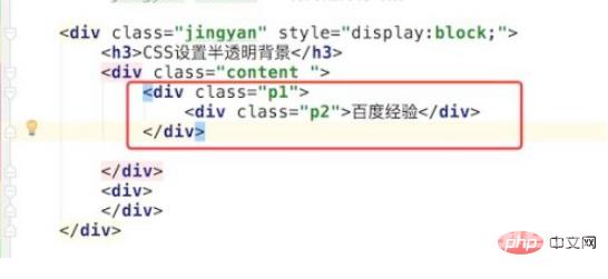2、然后为二个div写上对应的样式,如图,都是一些比较基础的css代码,为了显示透明效果,我们在样式为p1的div里,添加了一张背景图。