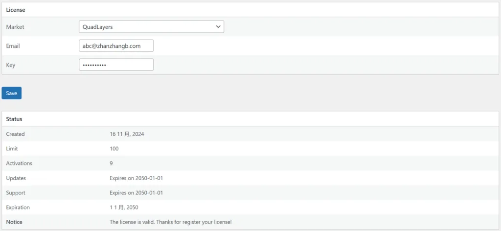 - 许可证信息,Email:abc@zy.zhanzhangb.cn,Key:zhanzhangb(如下图)