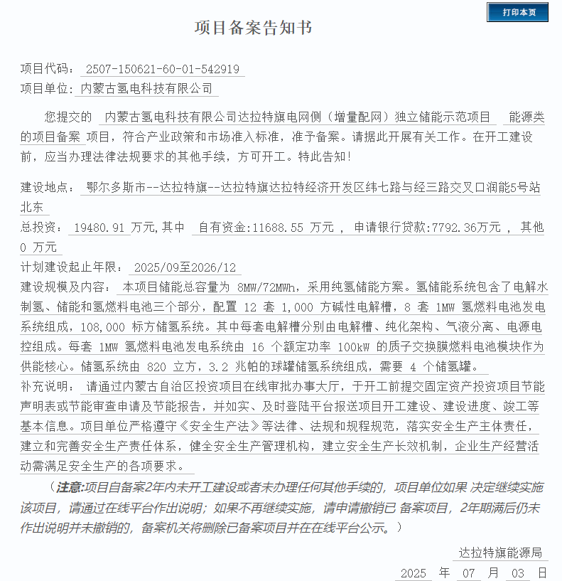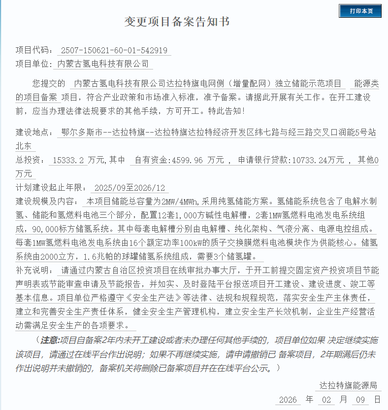 内蒙古氢电科技有限公司达拉特旗电网侧(增量配网)独立储能示范项目变更备案。