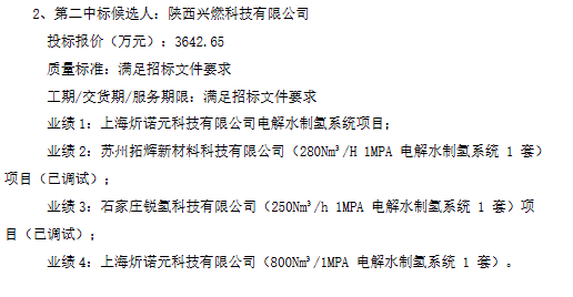 根据公示:第一中标候选人为长春绿动氢能科技有限公司,投标报价为3088万元;第二中标候选人为陕西兴燃科技有限公司,投标报价为3642.65万元。