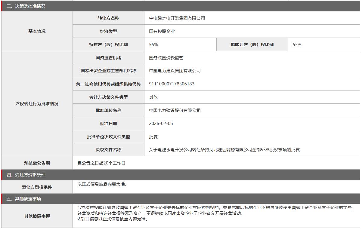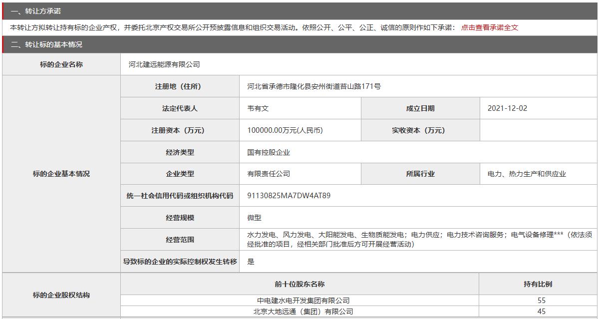 据披露,河北建远能源有限公司是55%股权及相关债权进行转让,公司成立于2021年12月2日,注册资本10亿元,经营范围包括水力发电、风力发电、大阳能发电、生物质能发电;电力供应;电力技术咨询服务;电气设备修理***(依法须经批准的项目,经相关部门批准后方可开展经营活动)。该公司由中电建水电开发集团有限公司持股55%、北京大地远通(集团)有限公司持股45%,前者为国有控股企业。