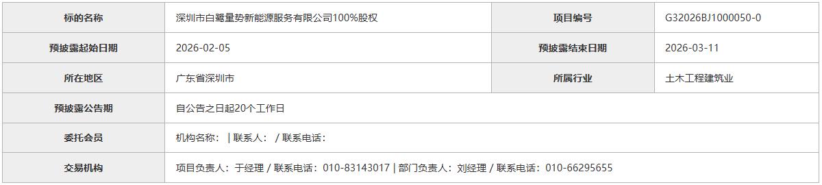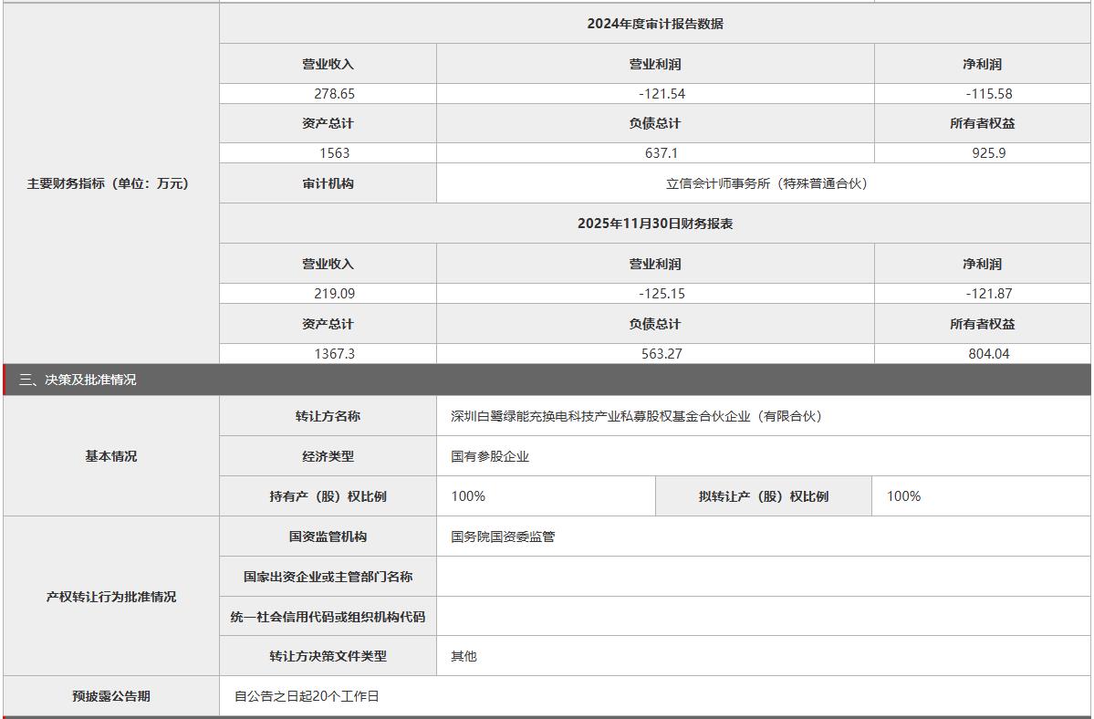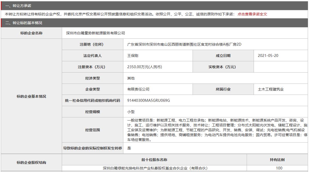 深圳市白鹭量势新能源服务有限公司为100%股权转让,公司成立于2021年5月2日,注册资本2350万元,经营范围包括新能源工程、电力工程总承包;新能源电站、新能源技术、新能源系统产品开发、咨询、设计、施工、运行维护以及相关技术服务、技术转让;工程项目管理;分布式太阳能光伏发电、储能工程设计、施工安装及运营维护;为新能源工程、节能工程的产品研究、开发、销售、安装、调试;充电桩销售;电气机械设备销售;电池销售;提供场地、商铺租赁服务;为电动汽车提供电池充电服务;国内贸易。许可经营项目是:停车场经营服务。该公司由深圳白鹭绿能充换电科技产业私募股权基金合伙企业(有限合伙)100%持股,后者是国有参股企业。