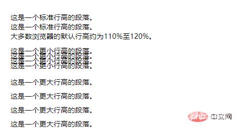 <!DOCTYPE html><html><head><meta charset="utf-8"> <title>php.cn</title> <style>p.small {line-height:70%;}p.big {line-height:200%;}</style></head><body><p>这是一个标准行高的段落。<br>这是一个标准行高的段落。<br>大多数浏览器的默认行高约为110%至120%。<br></p><p class="small">这是一个更小行高的段落。<br>这是一个更小行高的段落。<br>这是一个更小行高的段落。<br>这是一个更小行高的段落。<br></p><p class="big">这是一个更大行高的段落。<br>这是一个更大行高的段落。<br>这是一个更大行高的段落。<br>这是一个更大行高的段落。<br></p></body></html>运行结果: