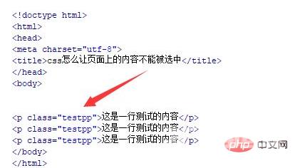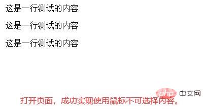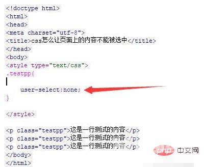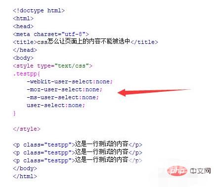 css实现内容不可选的方法:首先新建一个html文件;然后使用p标签创建多行文字,并给p标签添加一个class属性;最后通过“class(testpp)”设置页面文字的css样式,并将“user-select”属性设置为none即可。
