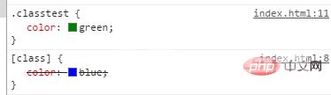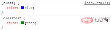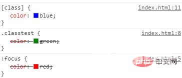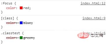 <!DOCTYPE html><html><meta charset="utf-8"><style type="text/css"> :focus { color: red; } [class] { color: blue; } .classtest { color: green; }</style></head><body><div class="classtest"> 什么颜色文字</div></body></html>如下图类选择器在后,所以覆盖前面的样式,所以文字绿色。