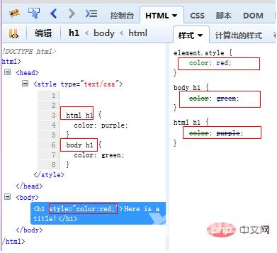 <!DOCTYPE html><html><style type="text/css">body h1 { color: green;}html h1 { color: purple;}</style></head><body><h1>Here is a title!</h1></html>body h1和html h1的优先级相同。