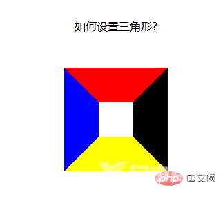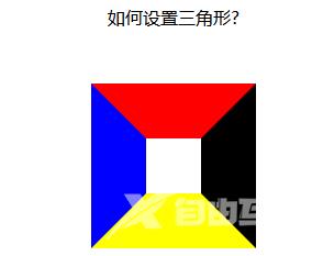 <!DOCTYPE html><html><head> <meta charset="UTF-8"> <meta name="viewport" content="width=device-width, initial-scale=1.0"> <meta http-equiv="X-UA-Compatible" content="ie=edge"> <title>Document</title> <style> div { width: 100%; margin: 50px 0; text-align: center; } span { position: relative; margin: 0 auto; display: block; width: 50px; height: 50px; border-style: solid; border-width: 50px; border-top-color: red; border-left-color: blue; border-bottom-color: yellow; border-right-color: black; } </style></head><body> <div>如何设置三角形?</div> <div> <span> </span> </div></body></html>运行结果:发现四面的边框,居然是这种梯形的结构,如果把梯形上底变为0,不就是我们想要的三角形了么,而且这是使用html 和css做不来的,不存在使用静态页面就可以实行,不存在图片的不连续显示问题;