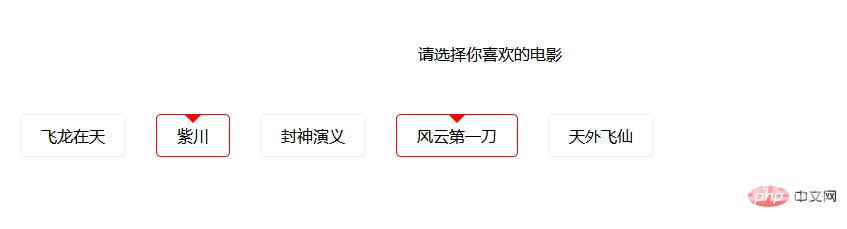 <!DOCTYPE html><html><head> <meta charset="UTF-8"> <meta name="viewport" content="width=device-width, initial-scale=1.0"> <meta http-equiv="X-UA-Compatible" content="ie=edge"> <title>Document</title> <style> div { width: 100%; margin: 50px 0; text-align: center; } .jindaobox { position: relative; width: 980px; margin: 20px auto; } li { list-style: none; float: left; position: relative; border: 1px solid #eee; margin-right: 30px; padding: 10px 20px; border-radius: 5px; -webkit-border-radius: 5px; -moz-border-radius: 5px; -ms-border-radius: 5px; -o-border-radius: 5px; } .active { border: 1px solid red !important; } .active::after { position: absolute; content: ""; height: 0; width: 0; border: 8px solid transparent; border-top-color: red; top: 0; left: 0; right: 0; margin: auto; } </style></head><body> <div>请选择你喜欢的电影</div> <ul> <li>飞龙在天</li> <li class="lis active">紫川</li> <li>封神演义</li> <li class="lis active">风云第一刀</li> <li>天外飞仙</li> </ul></body></html>运行结果: