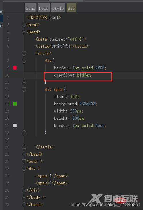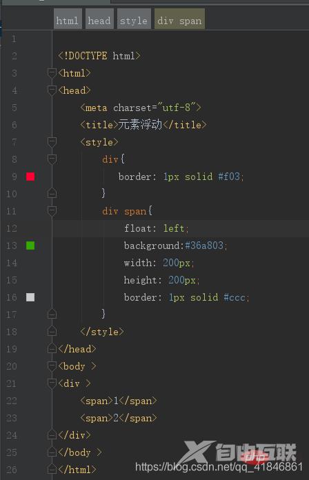 使用了float之后,父级盒子的高度变为0了。我们来写一个例子来看一下,创建一个父级div,并设置border属性,然后下边创建两个子元素span,并设置浮动。