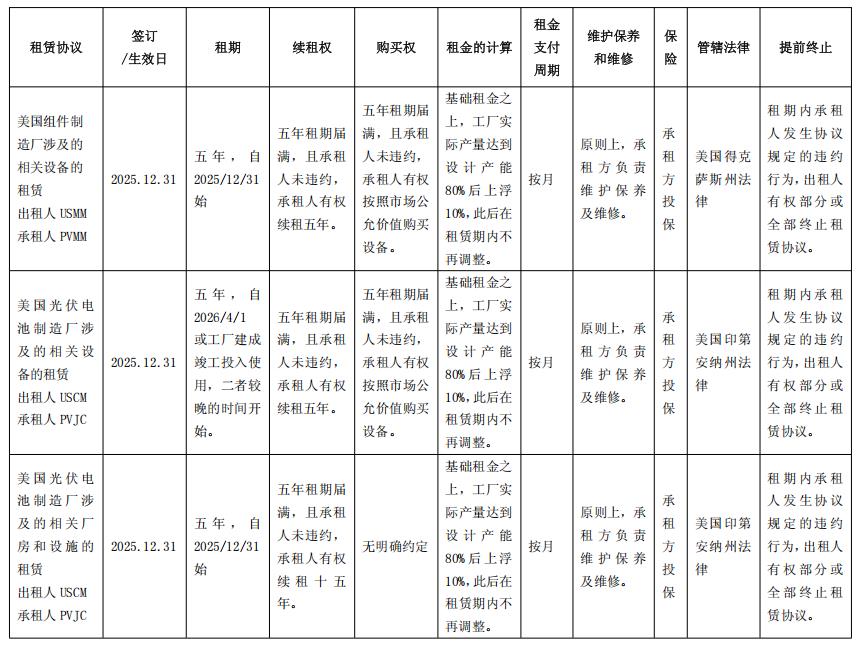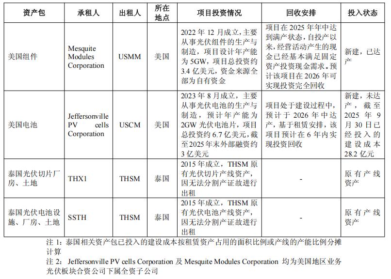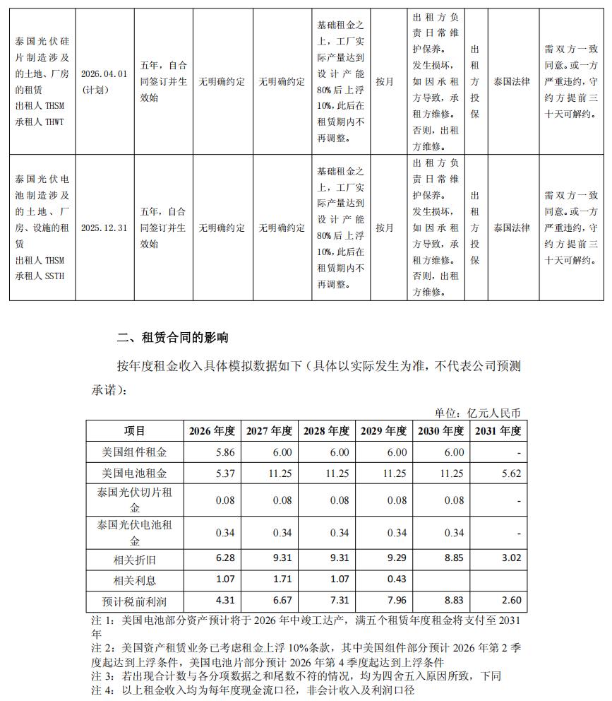 就公告来看,该公司在美国的业务分别位于不同的地区。其中,组件业务已经投产,但电池业务尚在建设过程中,预计将于2026年中达产。除了美国业务将采取出租方法外,其位于泰国的切片以及电池片业务,也将采取同样的方式。其中,除了泰国硅片业务的租赁合同拟于2026年4月内签订外,其他四分均已经签署完毕。