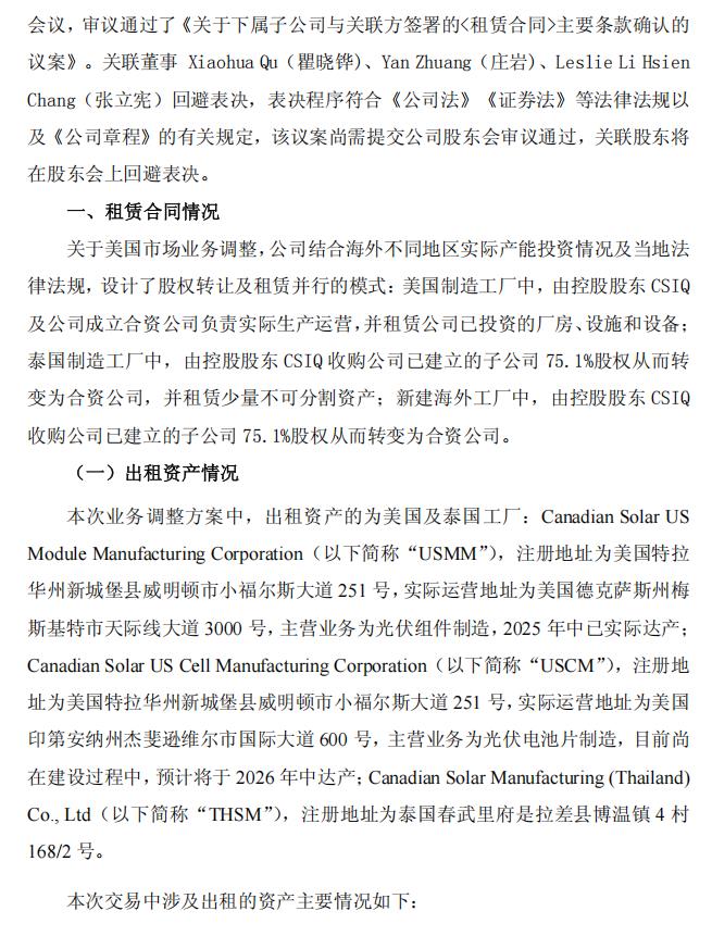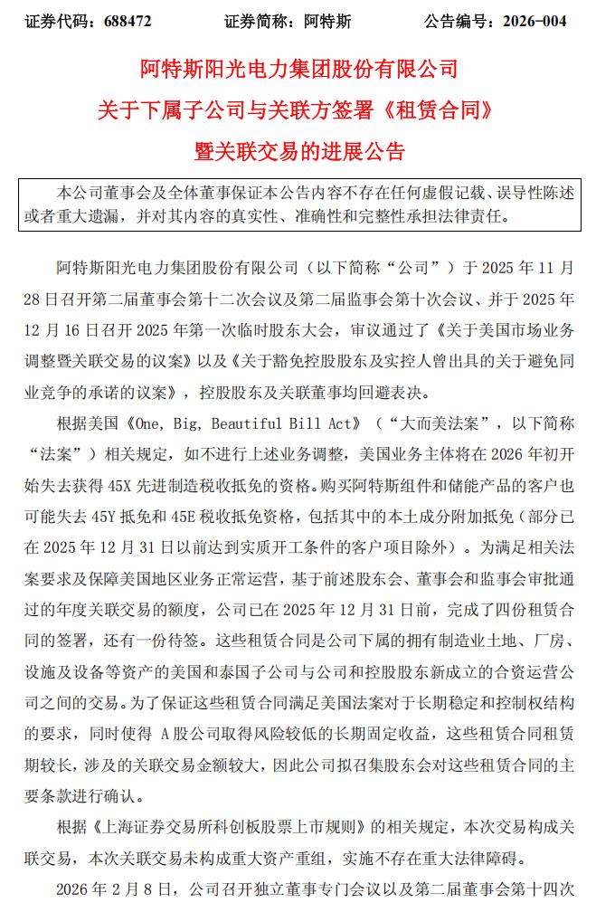 北极星太阳能光伏网获悉,2月10日晚,阿特斯发布公告公布了其美国业务调整的最新进展。根据公告,阿特斯已在2025年12月31日前,完成了四份租赁合同的签署,还有一份待签。这些租赁合同是阿特斯下属的拥有制造业土地、厂房、设施及设备等资产的美国和泰国子公司与公司和控股股东新成立的合资运营公司之间的交易。阿特斯表示,上述提案已经获得董事会批准,但尚需提交公司股东会审议通过,关联股东将在股东会上回避表决。