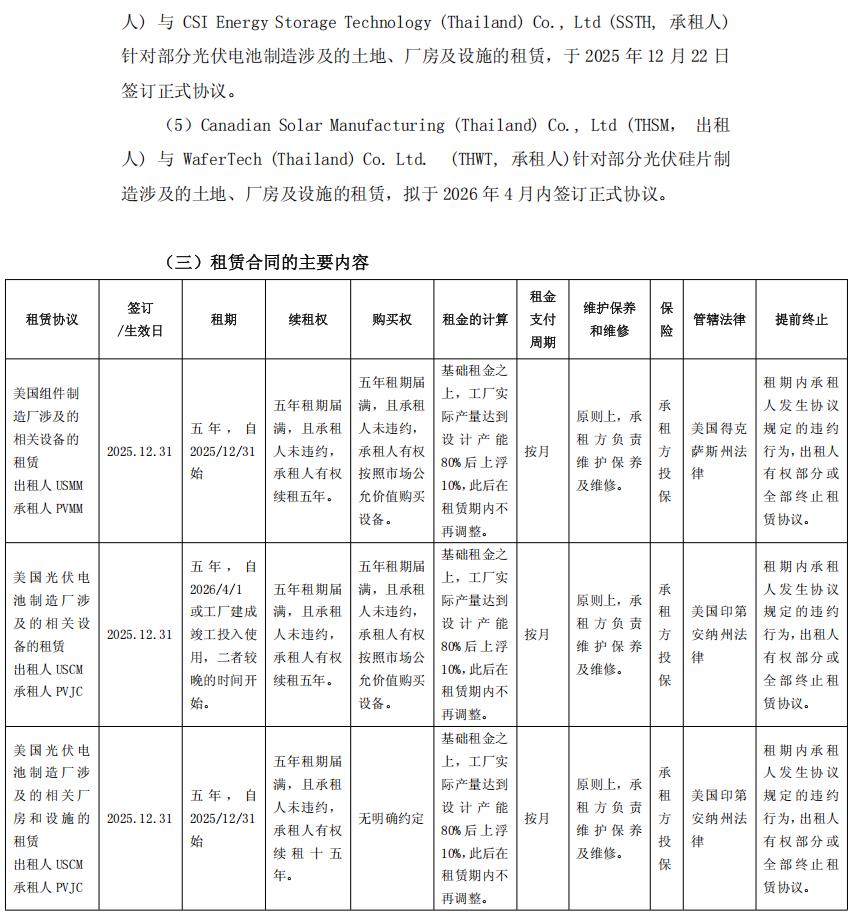 阿特斯称,关于美国市场业务调整,公司结合海外不同地区实际产能投资情况及当地法律法规,设计了股权转让及租赁并行的模式。其中,美国制造工厂中,由控股股东CSIQ及公司成立合资公司负责实际生产运营,并租赁公司已投资的厂房、设施和设备。泰国制造工厂中,则由控股股东CSIQ收购公司已建立的子公司75.1%股权从而转变为合资公司,并租赁少量不可分割资产;新建海外工厂中,由控股股东CSIQ收购公司已建立的子公司75.1%股权从而转变为合资公司。