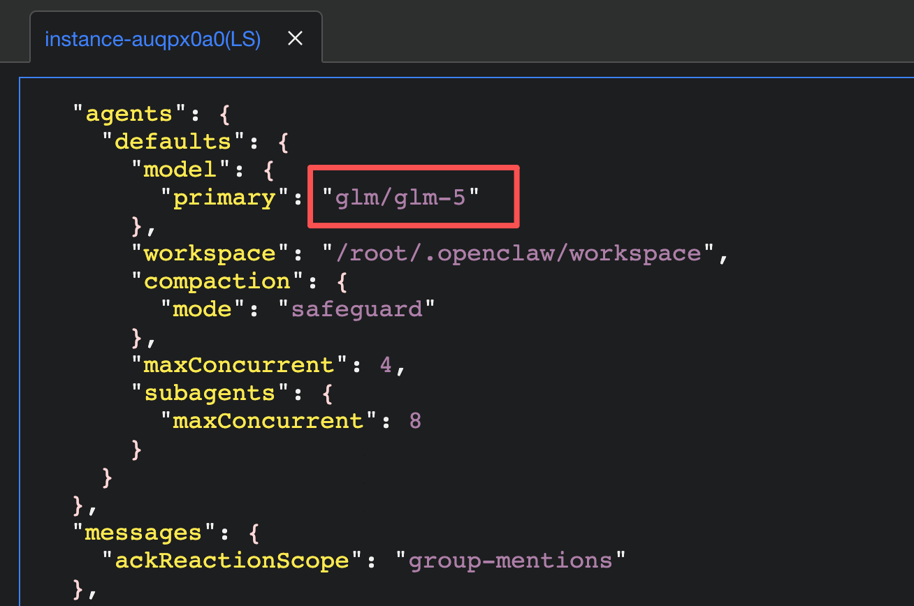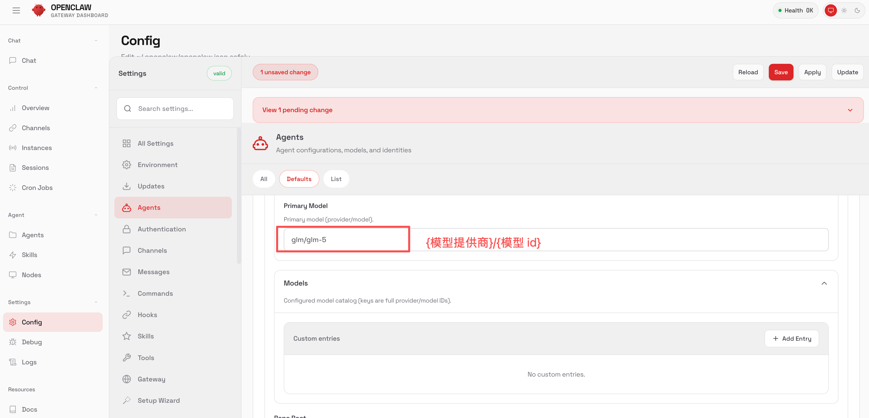 在配置中添加新模型,并且修改 agents.defaults.model.primary 配置默认模型:
