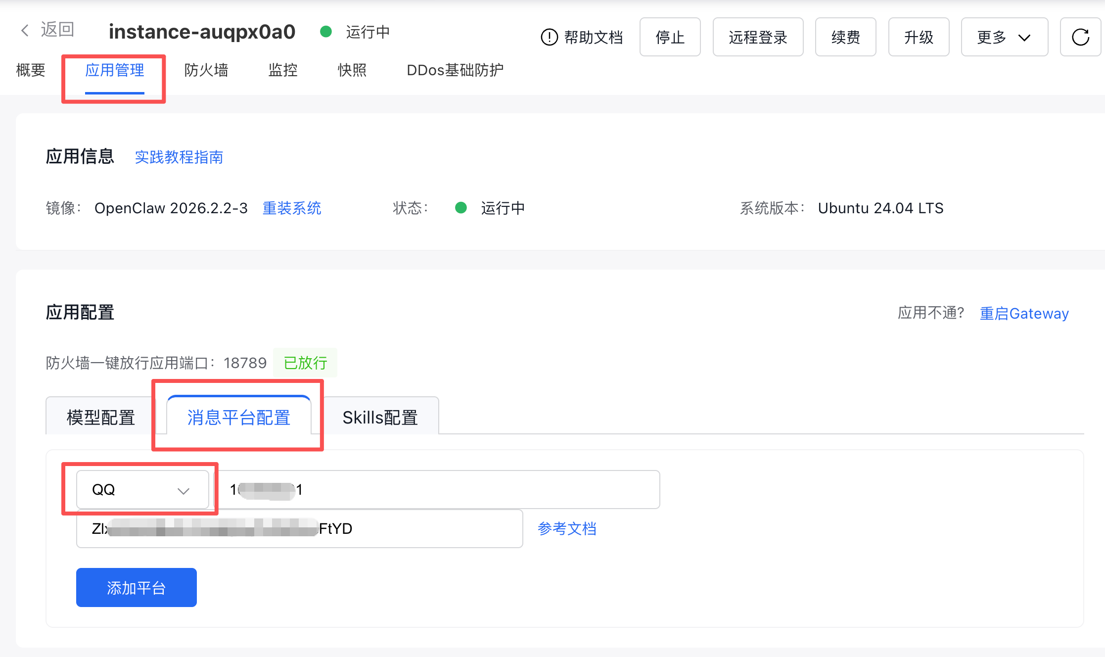 如果按照我之前写的 《OpenClaw 保姆级部署教程》 进行操作,已经在搭建 OpenClaw 时自动安装了 qqbot 插件。只需要在云服务器管理页面,找到 消息平台配置,下拉选择 QQ,把刚才的 AppID 和 AppSecret 填进去,点击应用,等它执行完就好了。